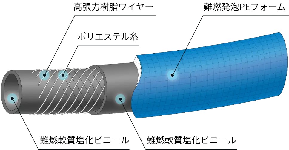こんな課題をまとめて解決できるのがTOYOX製の「フレイムブロックホース・フレイムブロックハイブリッドULホース」です。今回はフレイムブロックハイブリッドULホースの特長についてご紹介します。