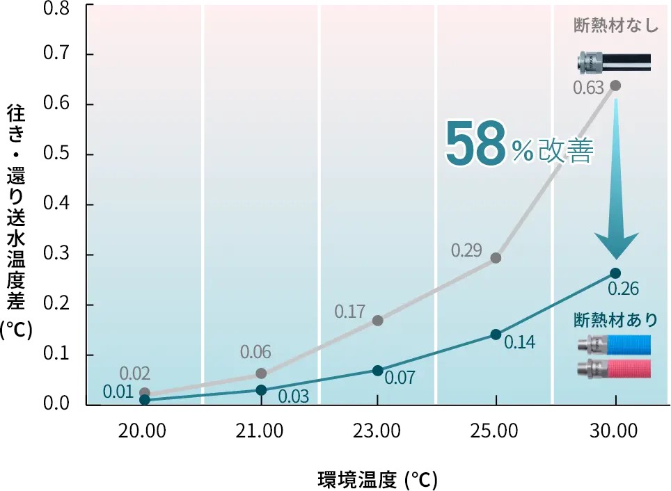 冷却水搬送用途で「結露防止」「保冷」のために ホースに断熱材を巻いているが、作業負担が大きい。 フレイムブロックハイブリッドULホースは 断熱材一体型で巻きつけ作業が不要。断熱材なしのホースと比較し、保冷性が58%改善。