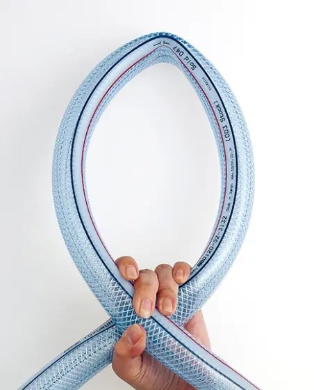 ポリエステル糸と高張力樹脂ワイヤーを編み込んだ ハイブリッド補強構造で一般的なホースを比較し、折れに強く、狭い箇所での配管作業の効率化、流量確保ができます。