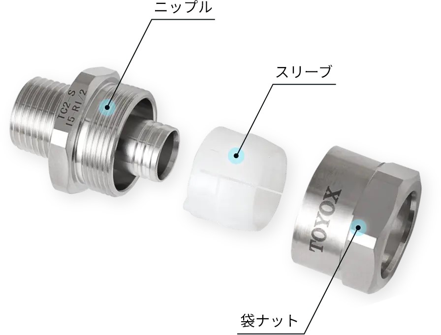 専用ホース継手「トヨコネクタライト」との併用でさらに安全性がアップします。幅広いスリーブが ホースを広範囲に抑え込み、漏れ・抜けのトラブルを防止します。