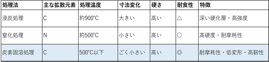 炭素固溶拡散処理は、従来の浸炭処理や窒化処理とよく比較されることがあります。それぞれ処理の特徴が異なりますが、窒化処理と比較しても耐食性に優れている点が炭素固溶拡散処理の最大の特長です。