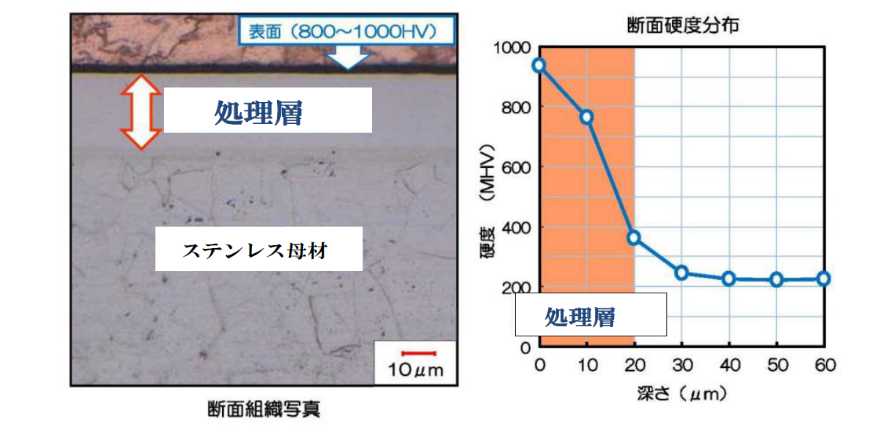 表面硬度はステンレス母材の4倍にもなり、高い表面硬度が得られ、耐摩耗性や疲労強度が著しく向上します。硬質クロムメッキの数十倍、窒化処理と同等以上の耐摩耗性を有します。